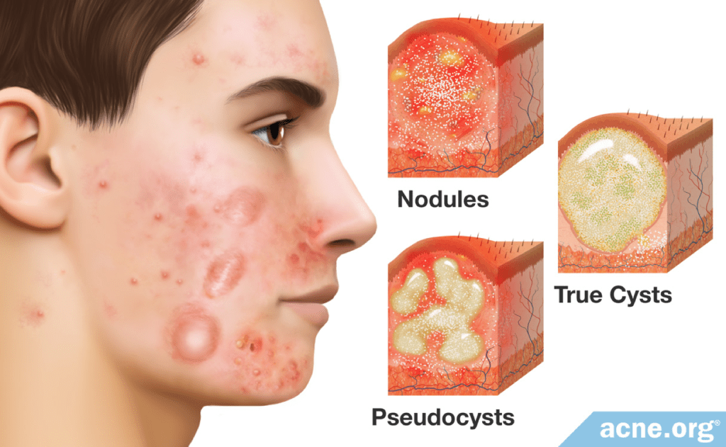 - Jerawat masuk ke dalam tahap paling serius dimana telah terjadi luka di dalam permukaan kulit sehingga bakteri jerawat menyebar dan membentuk segregasi. Dari penampilan luar, jerawat tampak sangat besar dan saling menyambung antar satu dengan yang lainnya, berwarna merah akibat pembengkakan, dan setelah sembuh akan meninggalkan bekas yang cukup signifikan.