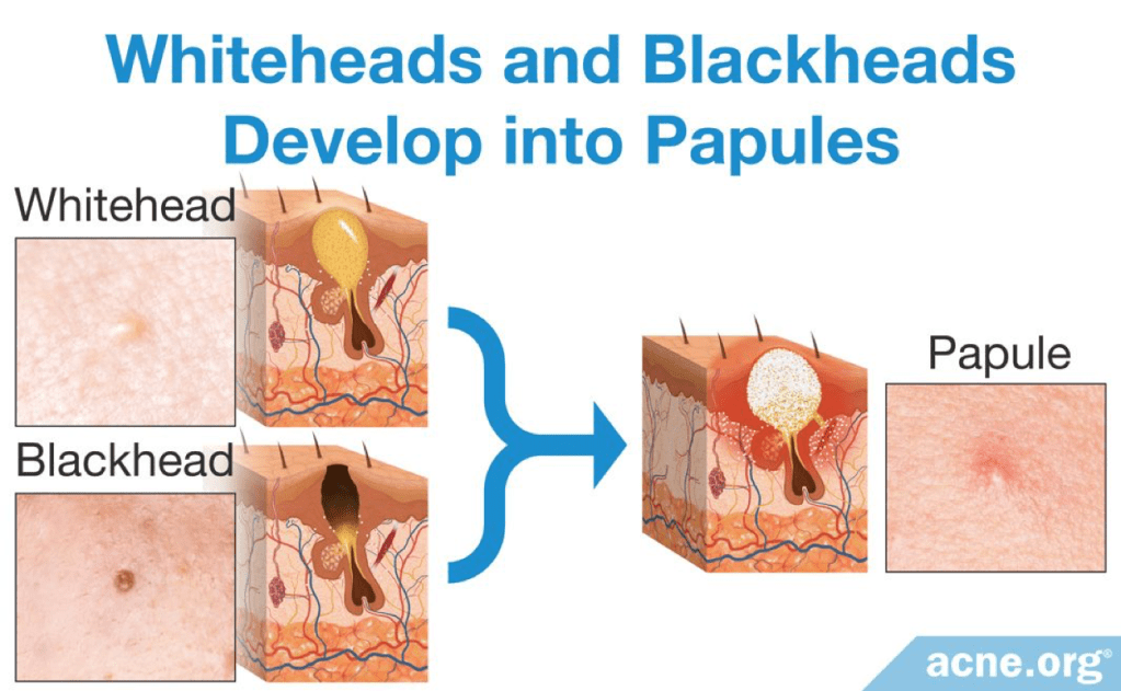 - Berbentuk seperti butiran kecil (dome shape) dengan warna kulit yang sama (komedo tertutup/whiteheads) atau dengan titik hitam di permukaan kulit (komedo terbuka/blackheads). Tidak ada inflamasi.